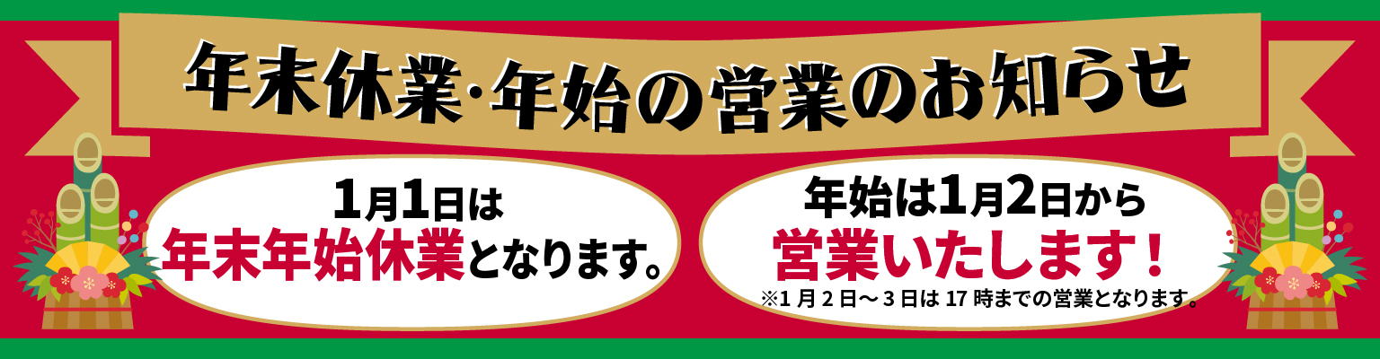 1月1日は休業となります。 1月2日~3日は、17時までの営業となります。