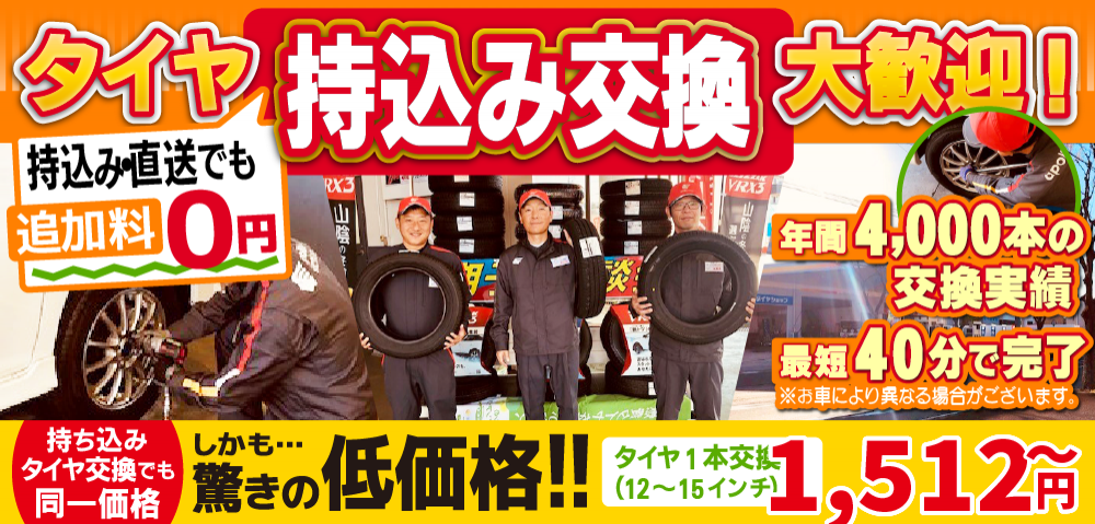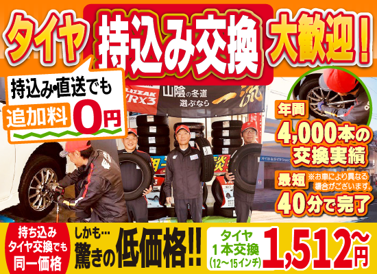 出雲・雲南で格安タイヤ交換1,512円!タイヤ持込も歓迎